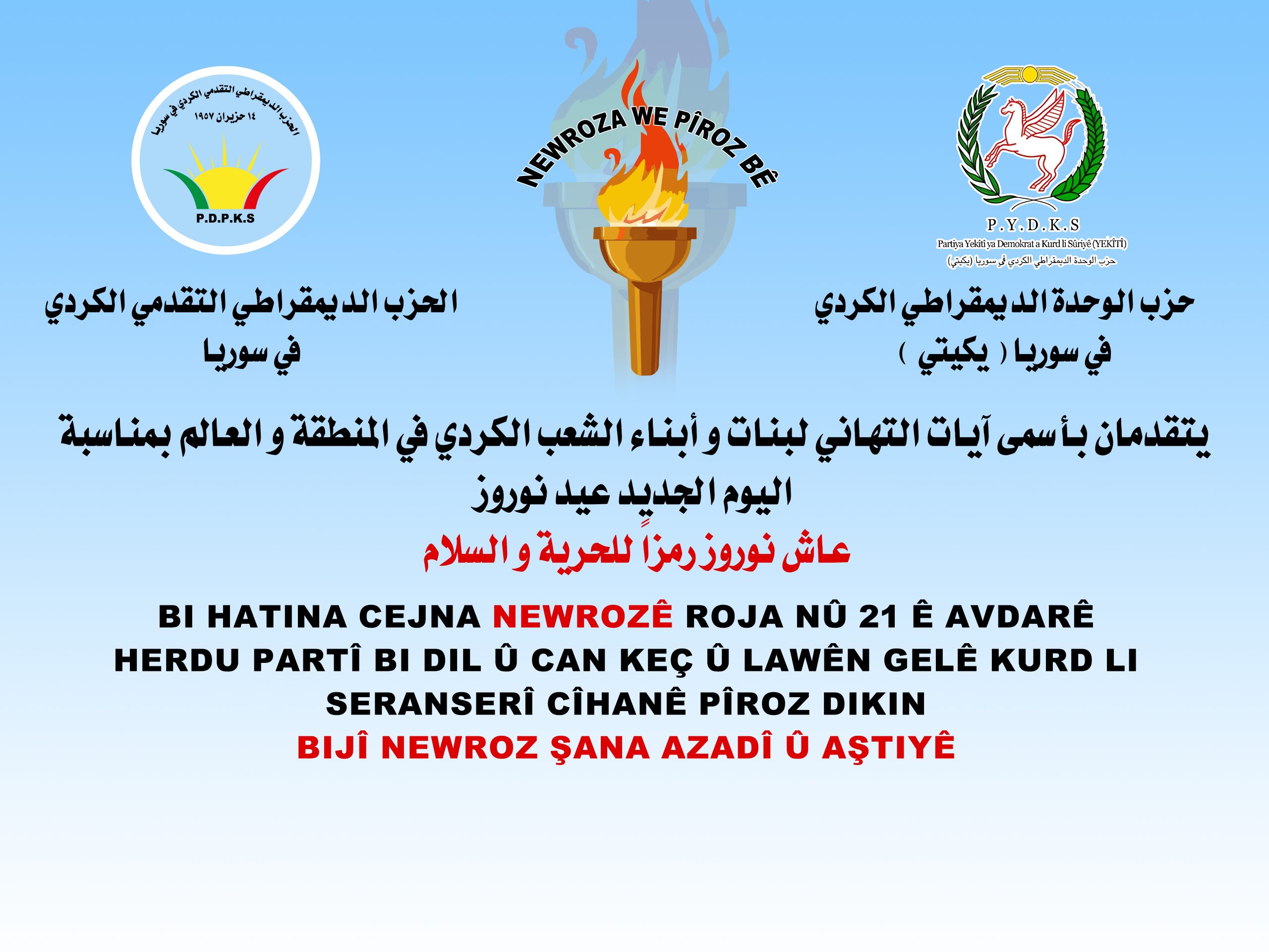 التقدمي والوحدة يهنئان الشعب الكردي بحلول عيد نوروز في Beşa Kurdî, اراء ومقالات, الاخبار السورية, الاخبار الكردستانية, الاخبار المحلية, الاخبار المميزة 2024-03-18 398 زيارة 2024-03-18 PDPKS
