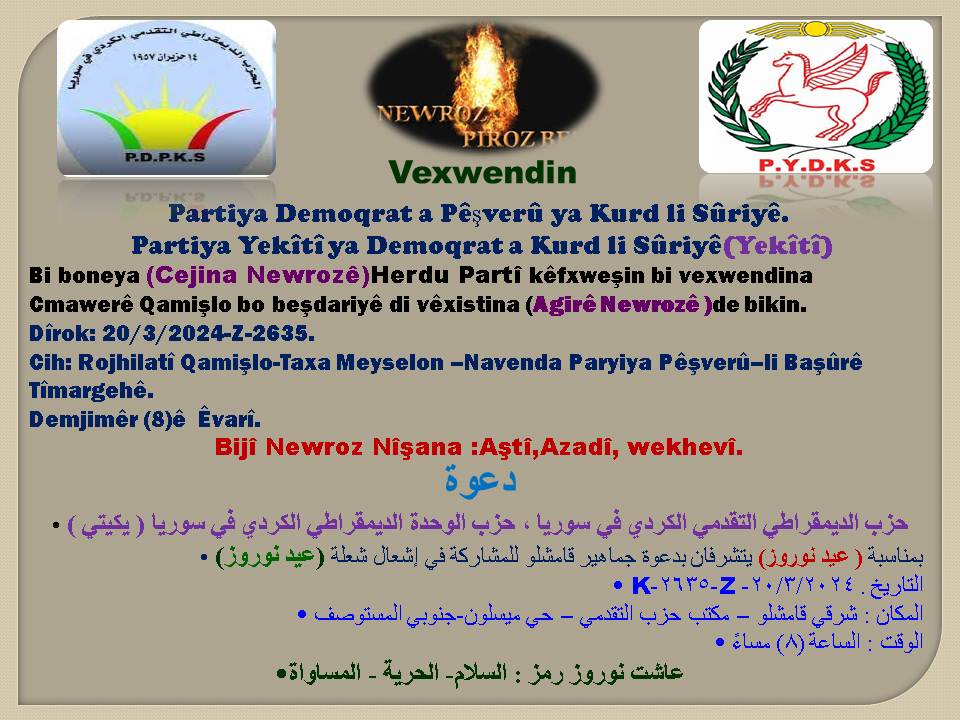 حزبا التقدمي والوحدة يدعوان الجماهير الكردية لإيقاد شعلة نوروز في حي الميسلون بالقامشلي في Beşa Kurdî, اخبار عامة, اراء ومقالات, الاخبار السورية, الاخبار الكردستانية, الاخبار المحلية, الاخبار المميزة 2024-03-20 631 زيارة حزبا التقدمي والوحدة يدعوان الجماهير الكردية لإيقاد شعلة نوروز في حي الميسلون بالقامشلي 2024-03-20 PDPKS