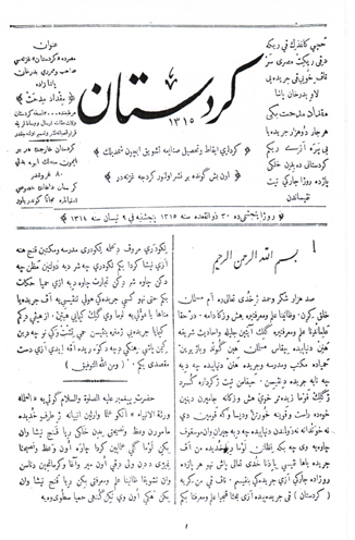 وصدر العدد الأول من جريدة كردستان في القاهرة يوم الخميس 22 نيسان عام 1898م، الموافق لـ 30 ذي القعدة عام 1315هـ، 9 نيسان عام 1314 رومي عثماني.