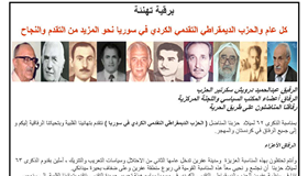 برقية تهنئة إلى الأستاذ عبد الحميد درويش سكرتير الحزب الديمقراطي التقدمي الكردي في سوريا. يشرفني ويسعدني إن أتقدم إليكم وإلى حزبكم باسمي باسم اللقاء الوطني الديمقراطي في سوريا بأحر التهاني والتبريكات بمناسبة مرورالذكرى الثانية والستين على تأسيس أول تنظيم سياسي كردي في سوريا, حيث كنتم أحد المؤسسين الأوائل لهذه التنظيم الذي عبر عن طموحات الكرد السوريين في الحرية والكرامة والعدالة ...