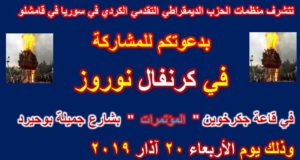 منظمات الحزب الديمقراطي التقدمي الكردي في سوريا في قامشلو تدعو للمشاركة في كرنفالات نوروز