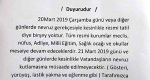 وجهت السلطات التركية كتابا إلى المجالس المحلية في عفرين طلبت من خلاله منع الاحتفال بعيد نوروز في كافة مناطق عفرين. وهذا يدل على شوفينية وعنصرية الدولة التركية التي تتبجح يوميا بإدارة ابناء عفرين لمنطقتهم، ويشكل الكرد في عفرين 99% من سكان المنطقة ، حيث من المفترض أن تكون الإدارة بيد أبنائها، إلا أن نسبتهم الفعلية في المجالس المحلية التي فرضتها ...