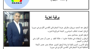 الحزب الديمقراطي التقدمي الكردي في سوريا ( منظمة عفرين ) برقية تعزية: الرفيق عبد الحميد درويش سكرتير الحزب الرفاق أعضاء المكتب السياسي و اللجنة المركزية للحزب الرفاق في منظمة عامودا الرفيق العزيز سعدالدين حسو عائلة الفقيد و عموم آل حسو الكرام في الوطن و المهجر . ببالغ الاسى و الحزن تلقينا نبا وفاة الرفيق عبدالله حسو نتقدم اليكم بمشاعر الحزن ...
