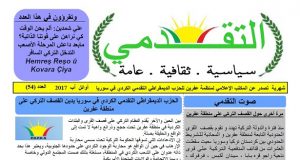 صدر العدد 54 من جريدة التقدمي التي تصدر عن المكتب الاعلامي لمنظمة عفرين للحزب الديمقراطي التقدمي الكردي في سوريا. وقد تضمن العدد المواضيع التالية صوت التقدمي مرة أخرى حول القصف التركي على منطقة عفرين الحزب الديمقراطي التقدمي الكردي في سوريا يدين القصف التركي على منطقة عفرين مؤسسة آرتا للإعلام و التنمية تكرم الاستاذ عبد الحميد درويش بجائزة آرتا للعطاء و ...