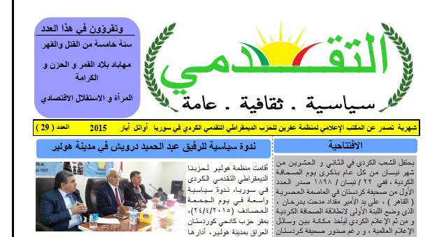 صدر العدد 29 من جريدة التقدمي الشهرية التي تصدر عن المكتب الاعلامي لمنظمة عفرين للحزب الديمقراطي التقدمي الكردي في سوريا باللغتين الكردية و العربية وقد تضمن العدد مواضيع متنوعة منها: الافتتاحية ندوة سياسية للرفيق عبد الحميد درويش في مدينة هولير الأستاذ أحمد سليمان يدلي بتصريح خاص لموقع الاعلام المركزي لحزبنا حول لقاء جنيف بين المجلس الوطني الكردي ومعهد الديمقراطية ...